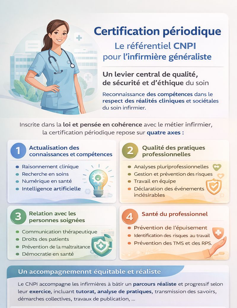 La certification périodique des infirmières constitue désormais un levier central de qualité, de sécurité et d’éthique du soin. C’est une opportunité de reconnaissance des compétences et non pas un simple exercice administratif. Le référentiel élaboré par le Conseil National Professionnel Infirmier (CNPI) pour l’infirmière diplômée d’État généraliste pose un cadre ancré dans les réalités cliniques, organisationnelles et sociétales du soin infirmier.