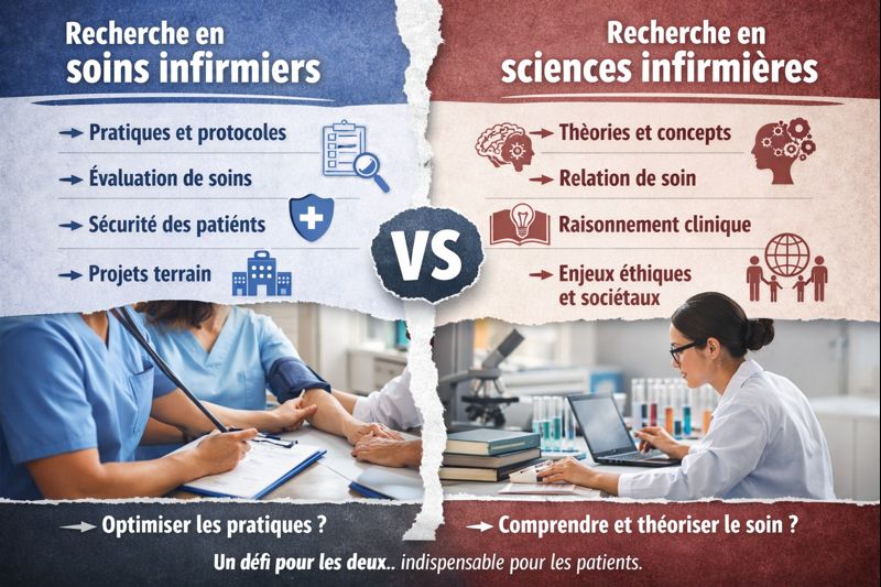 La confusion entre ces deux notions est fréquente. Elle n’est pas neutre. Elle conditionne la place accordée aux infirmières dans la production de connaissances, le type de financements accessibles et, in fine, l’impact réel sur les politiques de santé.
